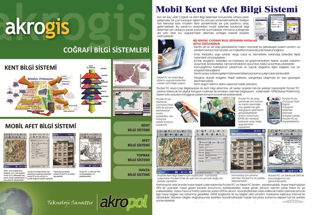 Hizmetleri § Ulusal Adres Bilgi Sistemi ve Yönetim Bilgi Sitemi ile Entegre Coğrafi Tabanlı Adres(Numarataj) Bilgi Sistemi § Coğrafi Bilgi Sistemi tabanlı Modern Afet Yönetim Bilgi Sistemi § Kent Bilgi Sistemi § Mezarlık Bilgi Sistemi § Çeşme Bilgi Sistemi § Mobil Haliç Bilgi Sistemi § Mobil Afet Bilgi Sistemi § Kamu Binaları Envanter Bilgi Sistemi § Havza Bilgi Sistemi § Toprak Yönetim Bilgi Sistemi § Emniyet Bilgi Sistemi § Yol Bilgi Sistemi § Ulaşım Bilgi Sistemi § Orman Bilgi Sistemi § İl Bilgi Sistemi § Kaynak Yönetim Bilgi Sistemi § Meteoroloji Bilgi Sistemi § Çevresel izleme Bilgi Sistemi § Binaların depreme dayanıklıklarına yönelik Envanter Bilgi Sistemi § CBS ve Afet yönetimine yönelik CBS uygulama yazılımlarının hazırlanması § Ulusal Adres Veri Tabanının CBS ile entegrasyonuna yönelik Uygulama yazılımlarının hazırlanması § Pocket PC üzerinde Mobil CBS uygulama yazılımlarının hazırlanması § GIS Server (Coğrafi Veritabanı Sunucusu) Kurulumu, Servislerin hazırlanması ve teknik destek hizmetleri. § Internetmapserver Kurulumu, Servislerin hazırlanması ve teknik destek hizmetleri. § Veritabanı tasarımı ve Sistem tasarımı hizmetleri § İlişkisel vertabanları(Oracle, DB2, Sybase, Informix, SQL Server Vb) arasında entegrasyon ve veri dönüşüm hizmetleri. § CBS ve CAD sistemleri arasında verilerin birbirleri ile birlikte çalıştırılması(Netcad, EGHAS, Autocad, Mapinfo, ArcGIS, Microstation) hizmetleri. § CBS Laboratuarlarının Kurulumu ve Bakımı Hizmetleri § CBS Eğitim Hizmetleri § CBS Analiz ve görselleştirme hizmetleri, Tematik harita hazırlama hizmetleri § 3D CBS Hizmetleri § Basılı Kent ve Şehir Haritaları Hazırlama Hizmetleri